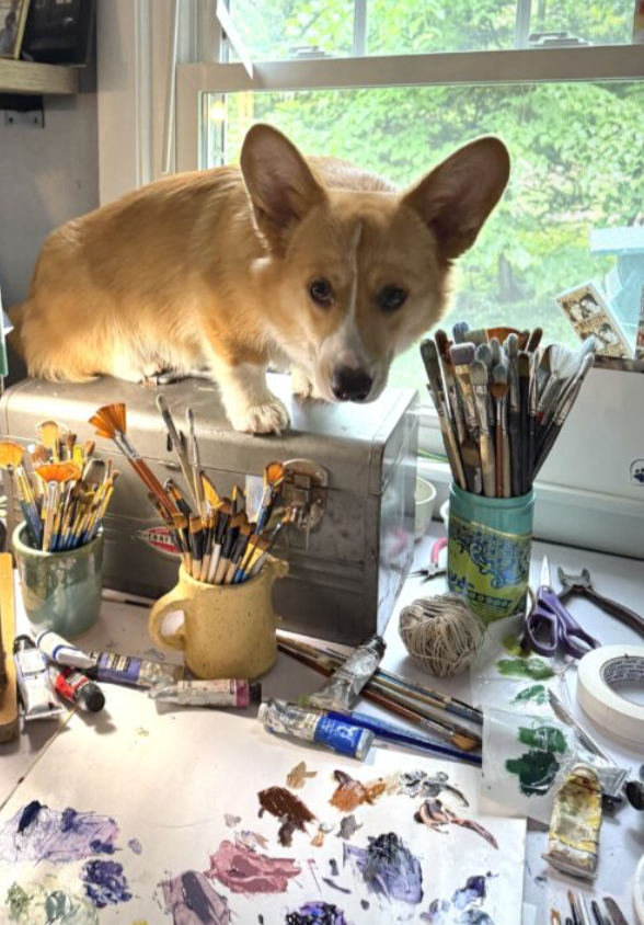 Creating art just speaks to my soul. I love the time I spend in my studio, painting brushes gripped in my mouth, overalls on, music playing and time just passing as I build something from the blank surface (with my little sidekick)